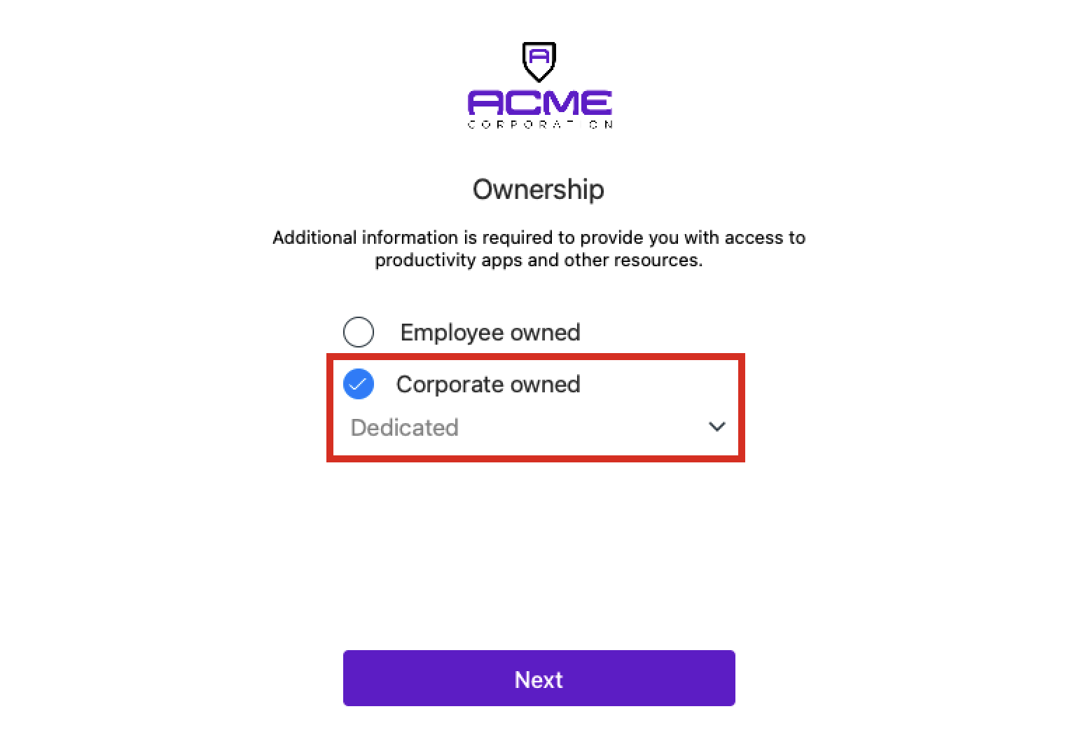 Note: If you select Corporate owned, you will also need to specify if the device will be dedicated to one user or shared by multiple users.