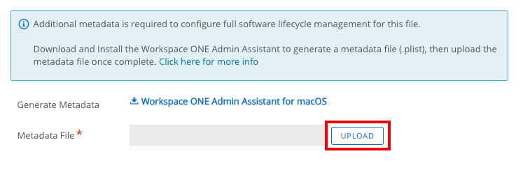 - Click Upload and select Choose File. Navigate to the folder that was created by the Workspace ONE Admin Assistant. Choose the PKG file and click Upload.