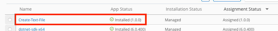 - Look for the app you created earlier. In this example, you will look for Create-Text-File. Check the App Status. If it was successful, the status will be Installed.