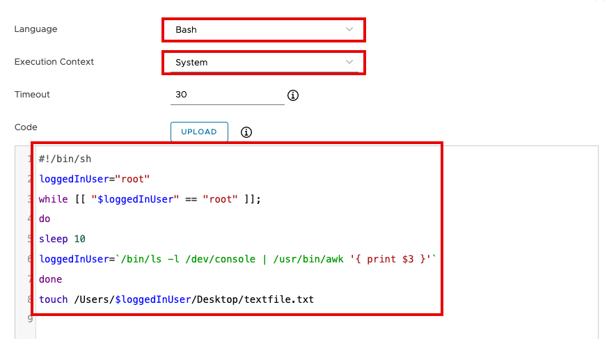 Create-File-On-Desktop. Leave App Catalog Configuration deactivated. Click Next. - Set the Language to Bash, and the Execution Context to System.