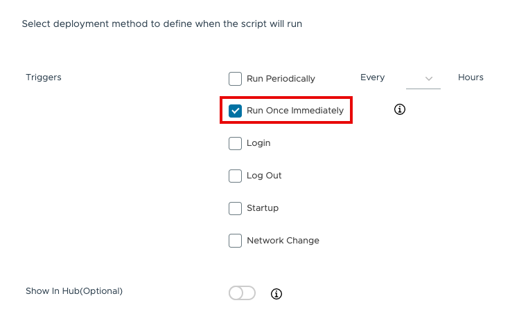 The Pre-Uninstall Script runs before the Workspace ONE Intelligent Hub initiates the uninstall. The pre-uninstall script must have an exit code of zero (0) for the uninstall to proceed.