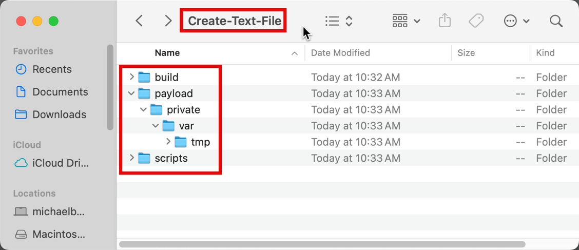 In the example shown, the package folder structure is located in~/Desktop/Create-Text-File. - Create the necessary folder structure for the payload-free package as shown in the below screenshot.