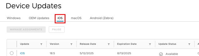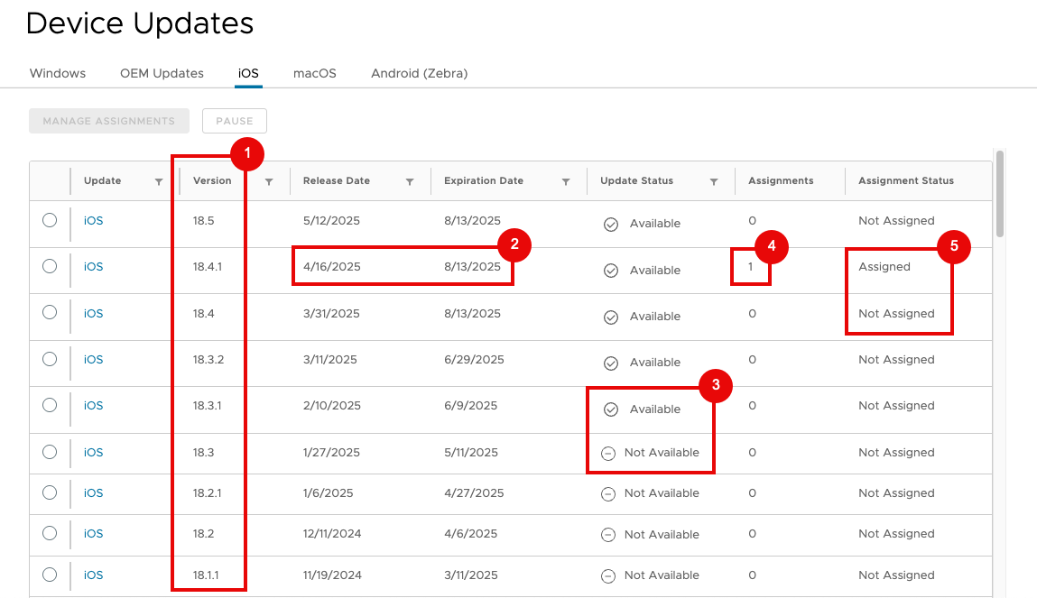 Note: The Assignments number does not necessarily equate to the number of smart groups assigned to the update. - Assignments Status – For each iOS update version, Workspace ONE displays whether that update has been Assigned to devices or Not Assigned. Additionally, if an administrator has paused an update, the update displays as Paused.