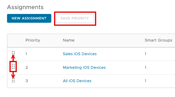 - Save Priority - Administrators use this button to save modifications to the priority they have set for assignments. Workspace ONE uses assignment priority to resolve schedule conflicts for devices in multiple assignments due to their Smart Group membership.