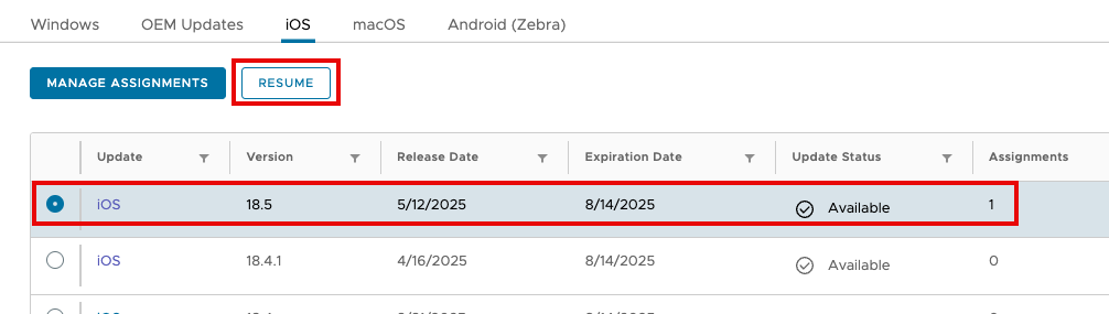 - To resume the iOS Update, select the row for the paused iOS update that you want to resume. Click Resume.