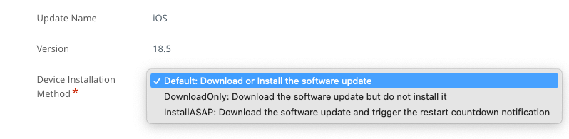 - Publish iOS updates to devices – Define the action to be taken on devices for updates. Available actions include download only, install only, or download and install immediately.
