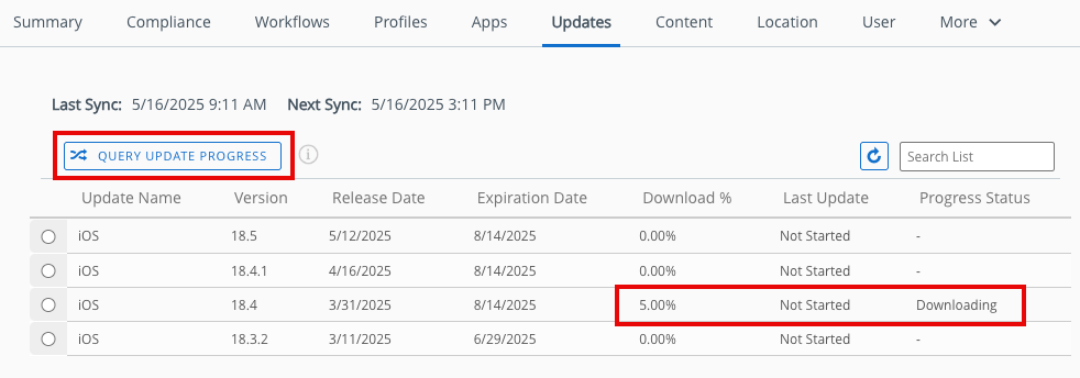 - Progress Reporting - Workspace ONE displays update progress as it is given from the device, including download percentage and install status.