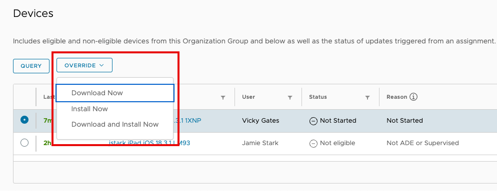 - Scroll down the screen until you see the list of devices assigned to this OS Update. Select a device from the list, and click the Override dropdown.