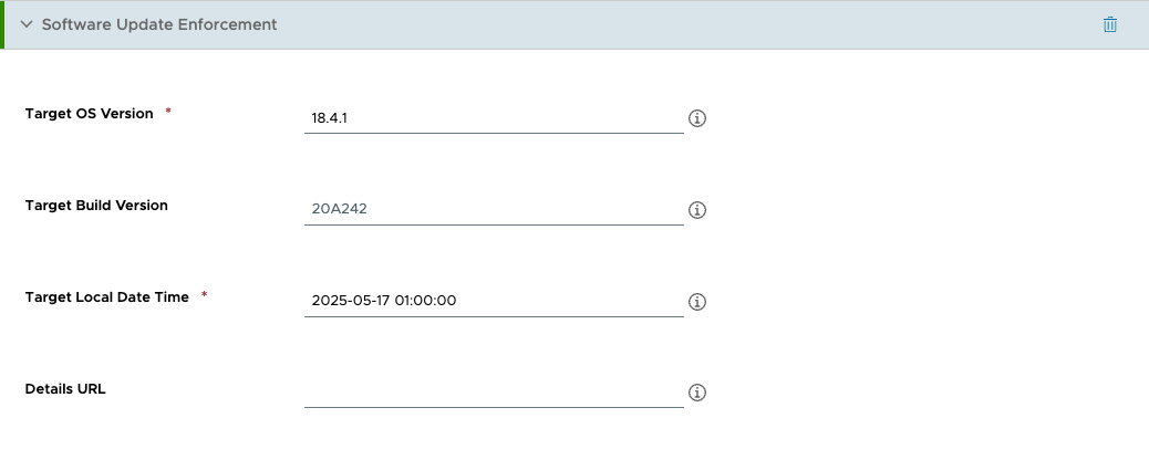 - Target OS Version - This is the target OS version to which you want your devices to update. This is a mandatory field. Example: 18.4.1.