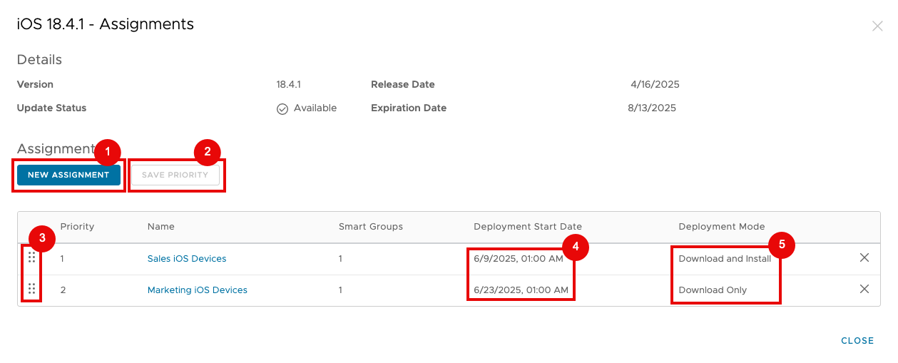 There will be instances where you need to have multiple assignments for an iOS Update, as well as adjust the priority for specific assignments. This section will detail how to add additional assignments and change the priority of existing assignments.