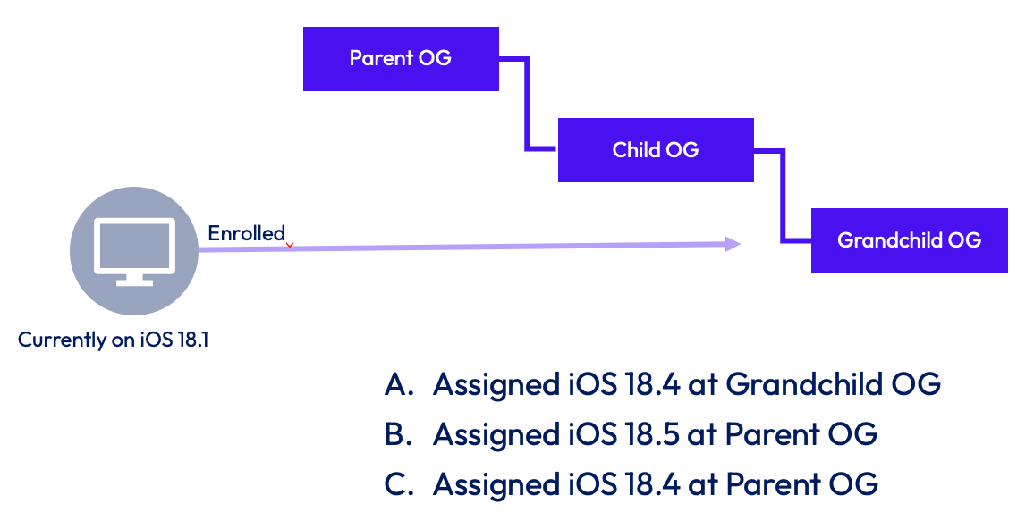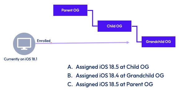 In this scenario, the device is enrolled in the Grandchild OG. A single iOS Update for 18.4 (A) has been assigned to the device at the Grandchild OG. An iOS Update for 18.5 (B) has been assigned at the Parent OG, as well as an iOS Update for 18.4 (C). In this case, Workspace ONE selects the update for 18.5 (B) because it contains the most recent iOS version assigned to the device (e.g. iOS 18.5 is prioritized over iOS 18.4).