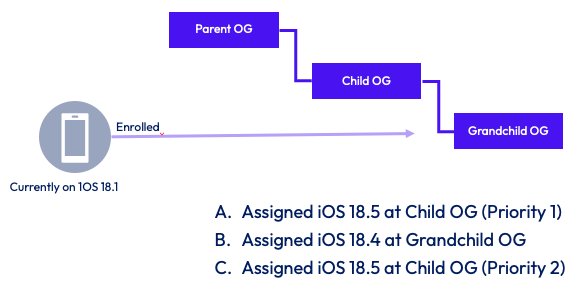 - Highest Priority Wins: If the same iOS device exists in multiple assignments for a single iOS Update in a single OG, the assignment with the highest priority takes precedence.