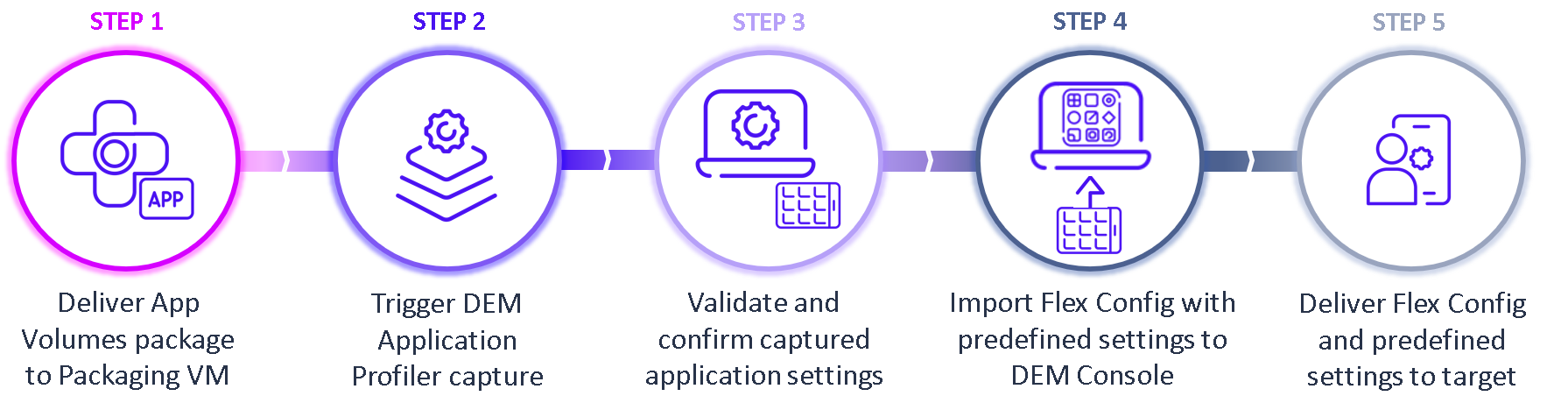 From the App Volumes Packaging Virtual Machine, installed with the Dynamic Environment Manager Application Profiler, the DEM administrator/packager initiates the following steps;