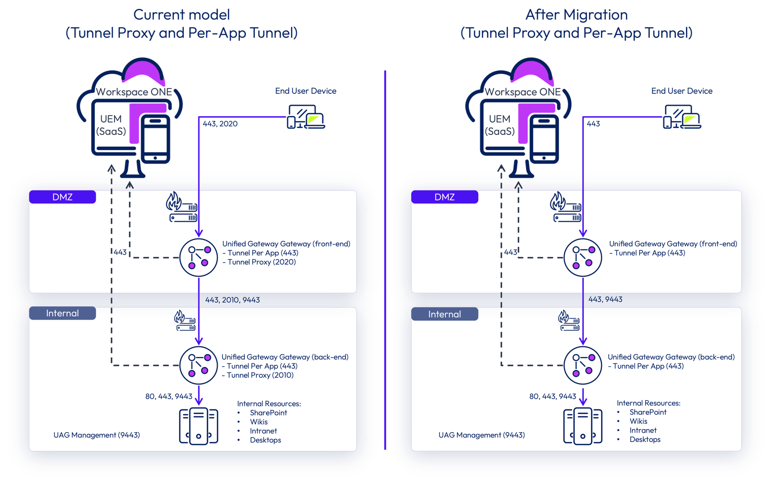 When you complete the migration steps, the only change to consider is from a network perspective. Only the Per-App Tunnel port must be open on the DMZ. Remove the firewall rules allowing access through TCP 2010 and 2020; they are no longer required.