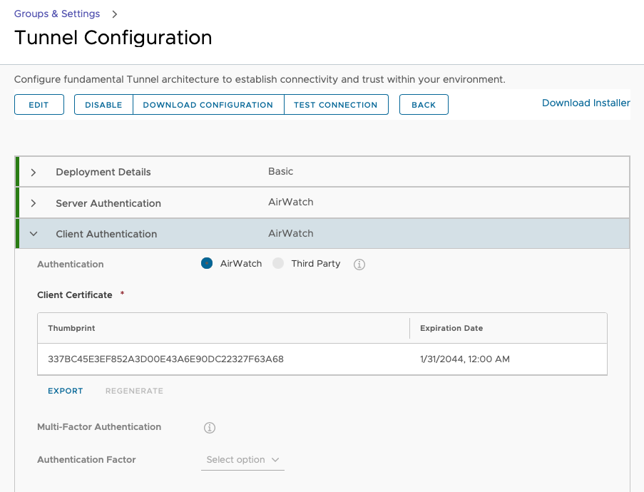 - Client Authentication for Tunnel only supports AirWatch CA; third-party CAs are not currently supported.