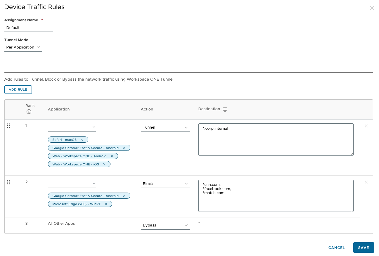 - The Workspace ONE Web app has been added to the rule without assigning a VPN profile. This ensures that the Tunnel SDK dynamically detects the destination URL to securely tunnel traffic, while also enabling seamless functionality on unmanaged devices.