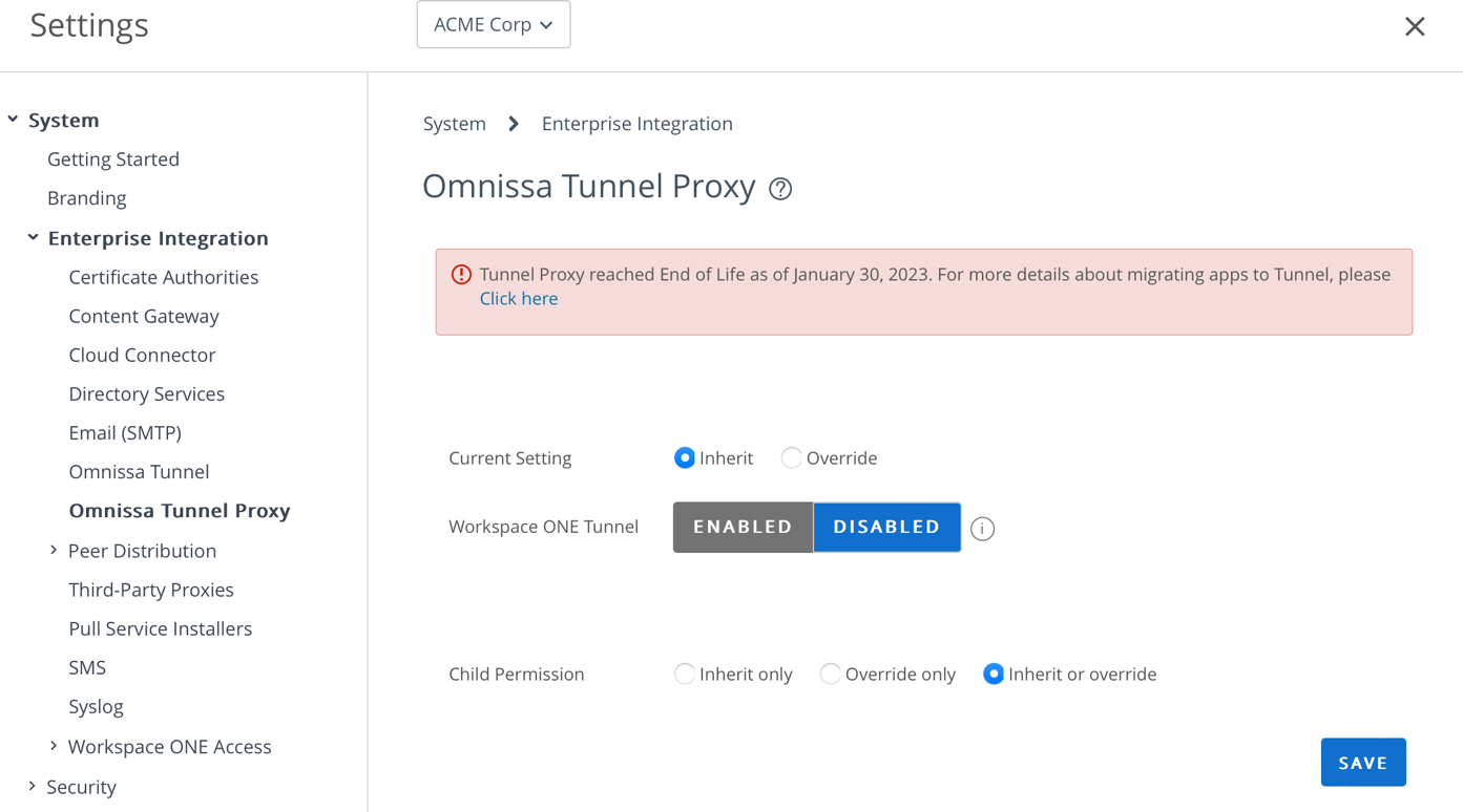 As such, The Tunnel Proxy component part of Workspace ONE Tunnel is no longer supported. See the Tunnel Proxy End of Support Life announcement. All Tunnel Proxy use cases have been consolidated into the Tunnel gateway, app, and SDK.