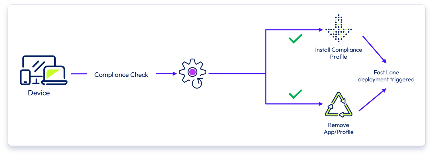 - Compliance policy triggered actions - A Fast Lane deployment is initiated when either resource(s) must be removed, or a compliance profile must be installed on a device based on Compliance policy evaluation on the device.