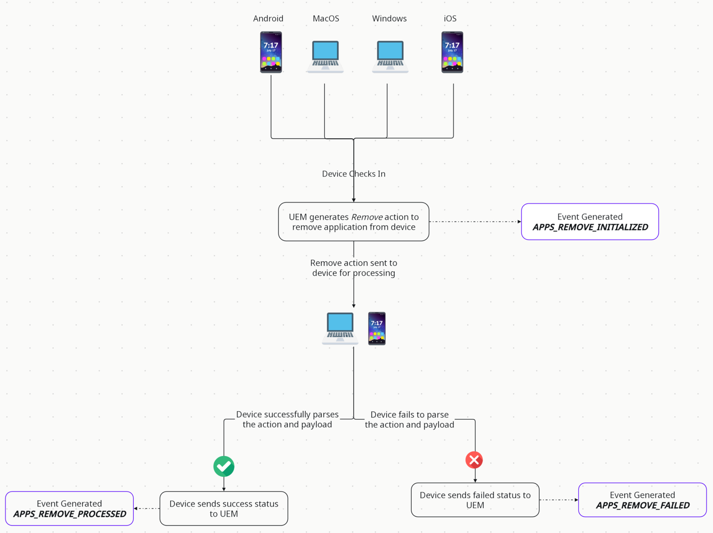 | Apps Remove Initialized Profiles Remove Initialized | This event is generated when the Remove or uninstall instruction is generated on the UEM server and is yet to be delivered to the device. |