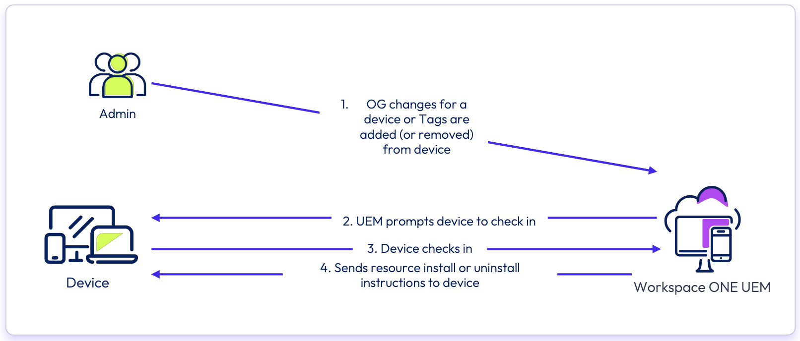 In legacy UEM environments, install or uninstall commands for applications or profiles are triggered by specific events, such as creating or updating assignments, modifying smart group rules, updating critical device attributes, automated workflow actions, and admin actions in the console, among others. As a result, the installation or uninstallation of an application or profile depends on these specific triggers impacting the device.