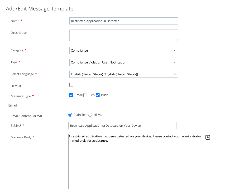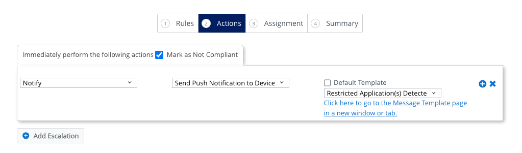 - Deselect Default Template and select the message template you created earlier called Restricted Application(s) Detected.