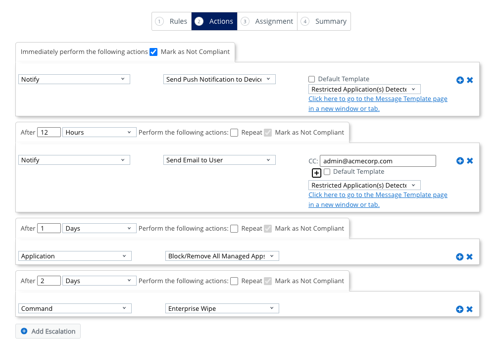 This escalation sequence serves as an example and can be customized to meet your organizational needs. While this article focuses on creating a single compliance policy, you can also develop multiple policies with varying escalation sequences. These policies can be more aggressive or more relaxed, depending on the risk level associated with the restricted apps.
