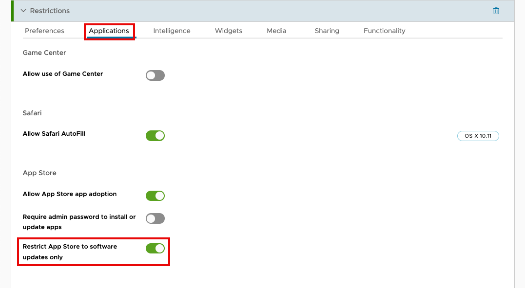 - Select the Applications tab. Scroll through the list of options until you find Restrict App Store to software updates only. Select the button to activate this option.