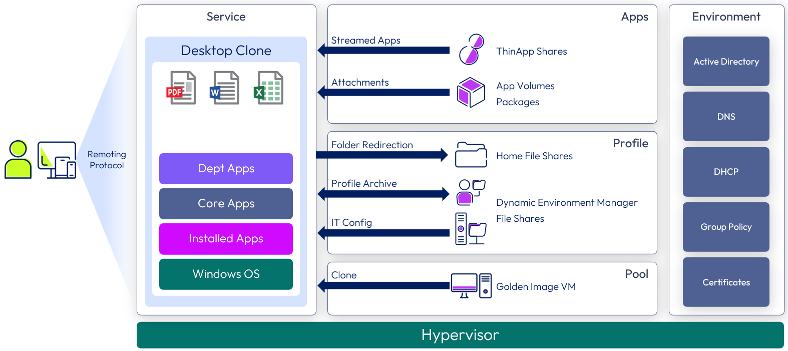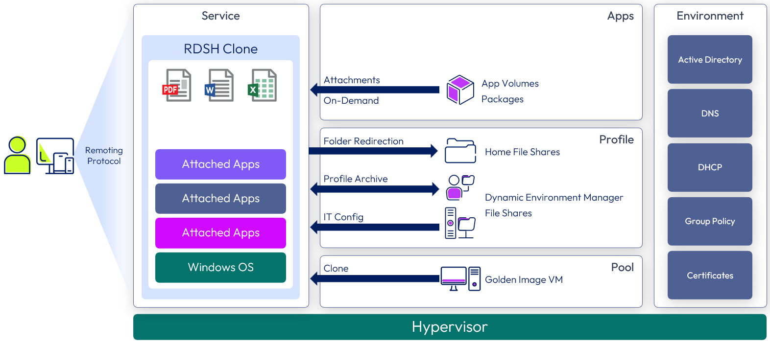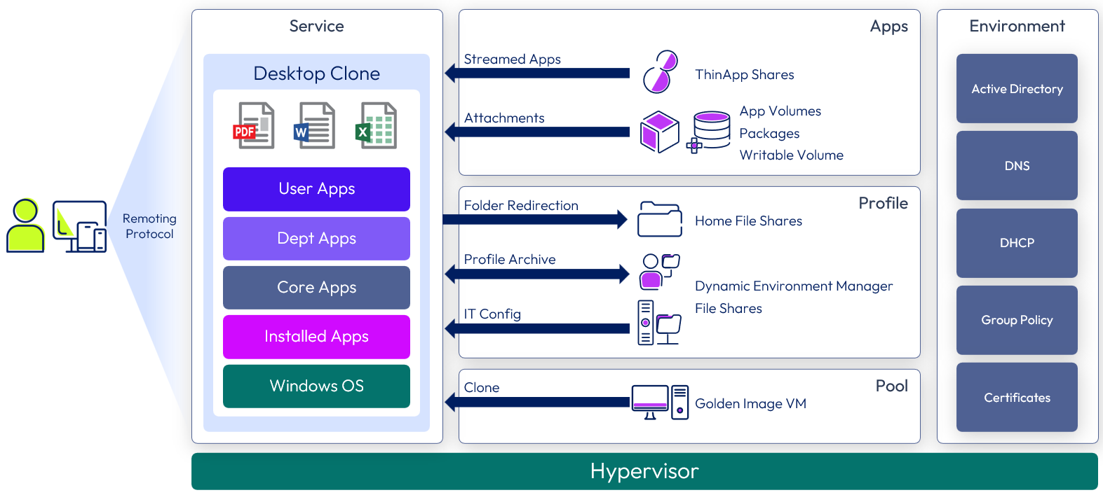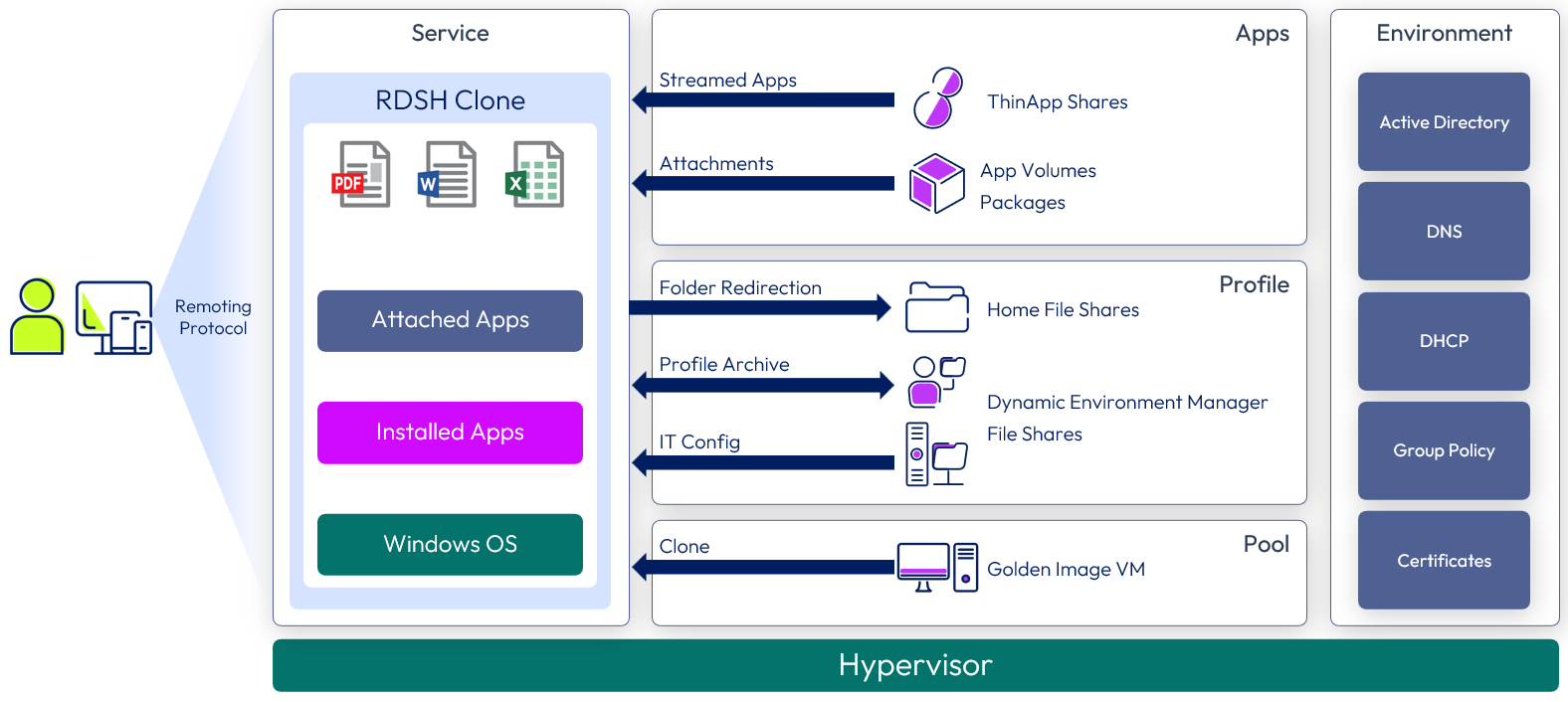 Overview: The core Windows desktop or RDSH server is a clone of a golden image VM. Dynamic Environment Manager applies the profile, IT settings, user configuration, and folder redirection.