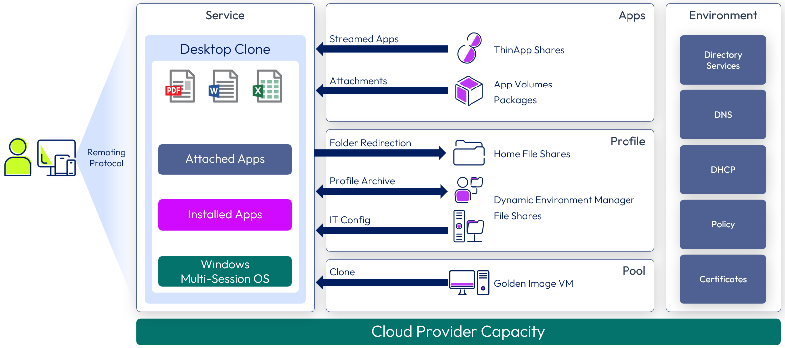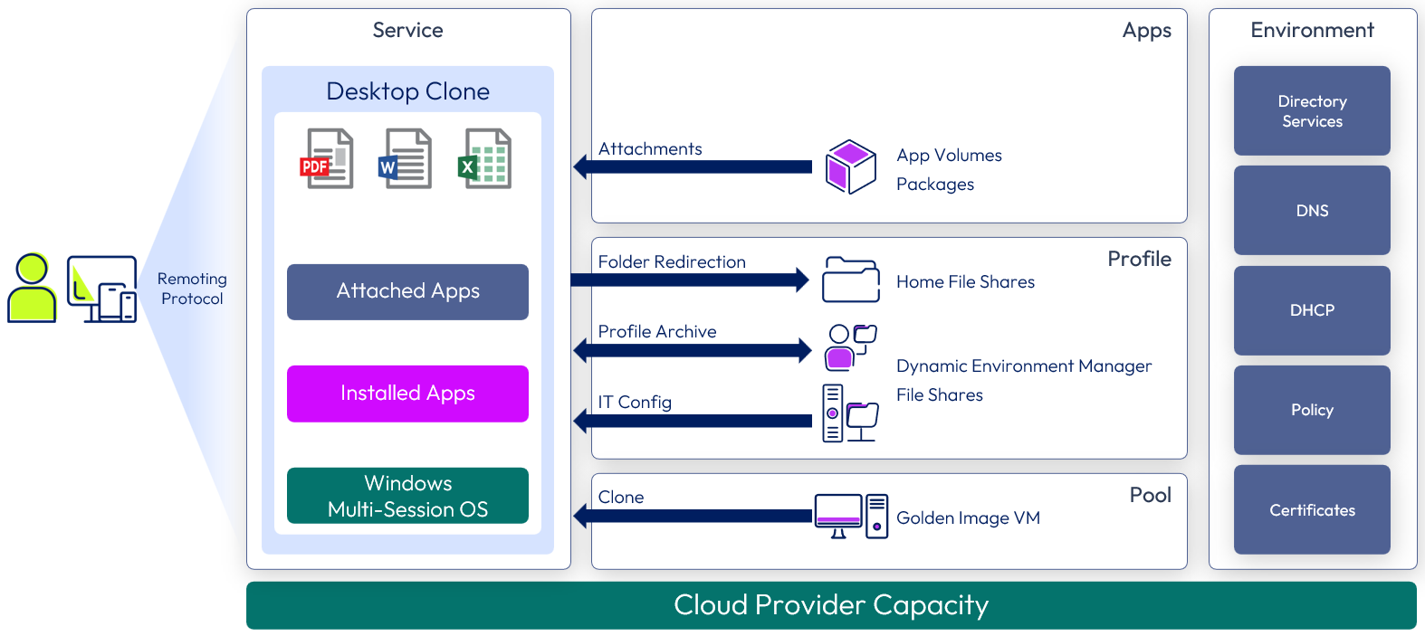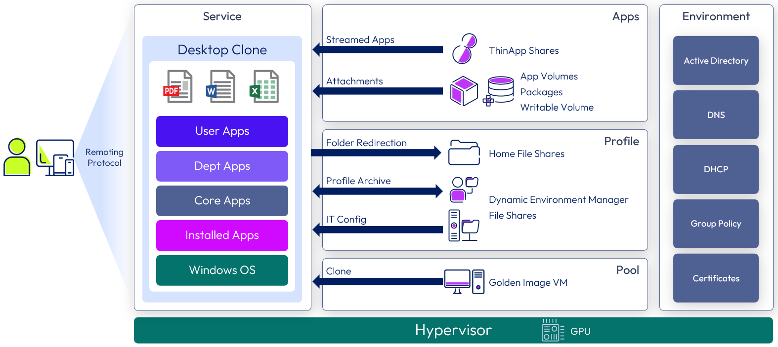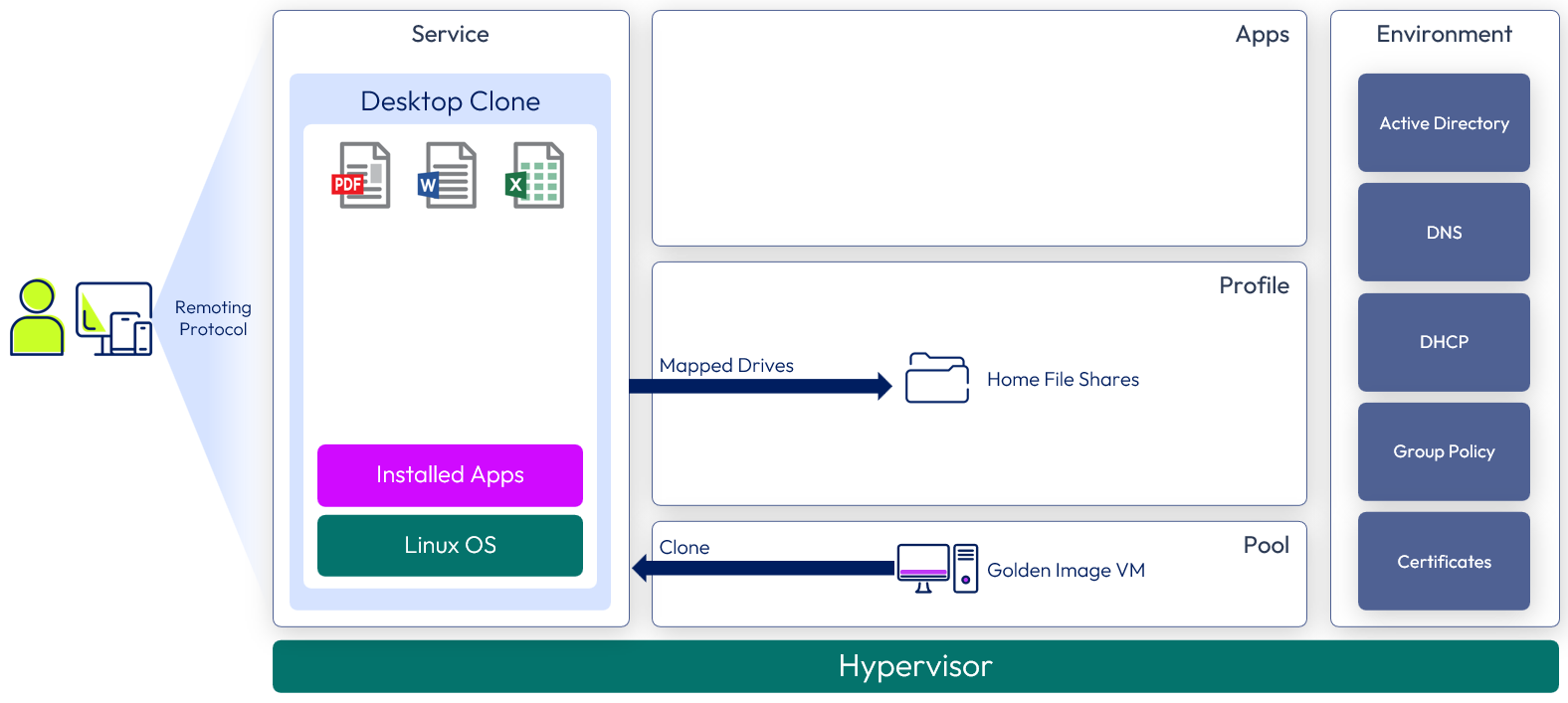 Overview: The core Windows desktop or RDSH server is a clone of a golden image VM. Dynamic Environment Manager applies the profile, IT settings, user configuration, and folder redirection.