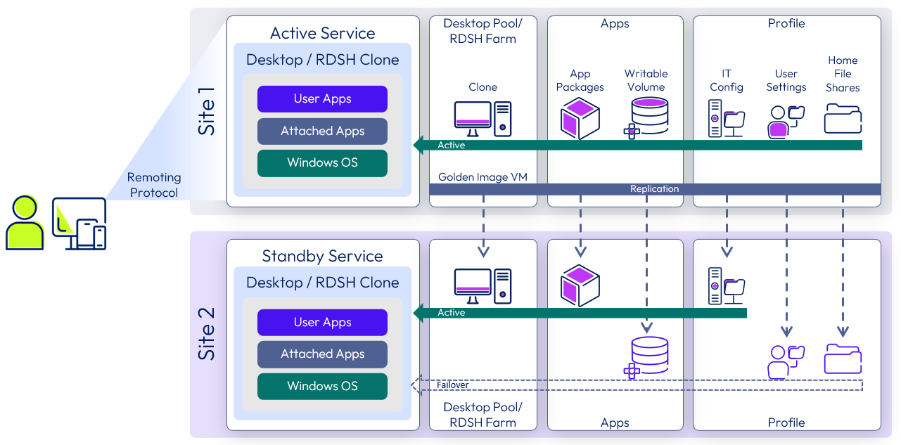 At a high level, this service consists of a Windows environment delivered by a desktop or an RDSH server available at both data centers. With this service, applications can be natively installed in the OS, attached using App Volumes packages, or some combination of the two. If required, the user profile and user data files can be made available at both locations and can also be recovered in the event of a site outage.