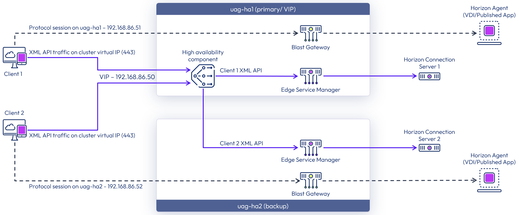- The virtual IP address 192.168.86.50 was assigned to the uag-ha1 VM, the primary appliance.