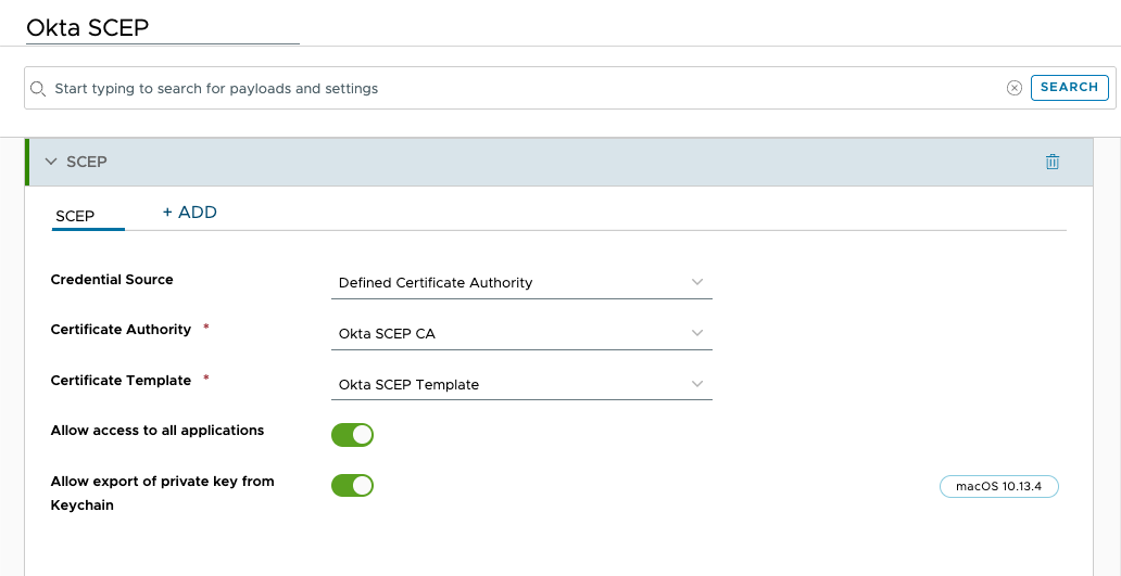 - Scroll down the list of payloads until you find SCEP. Click Add.
