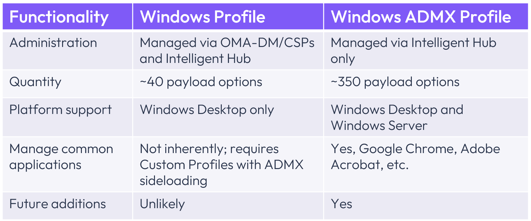 - Windows ADMX Profiles reapply every 1 hour unless configured otherwise