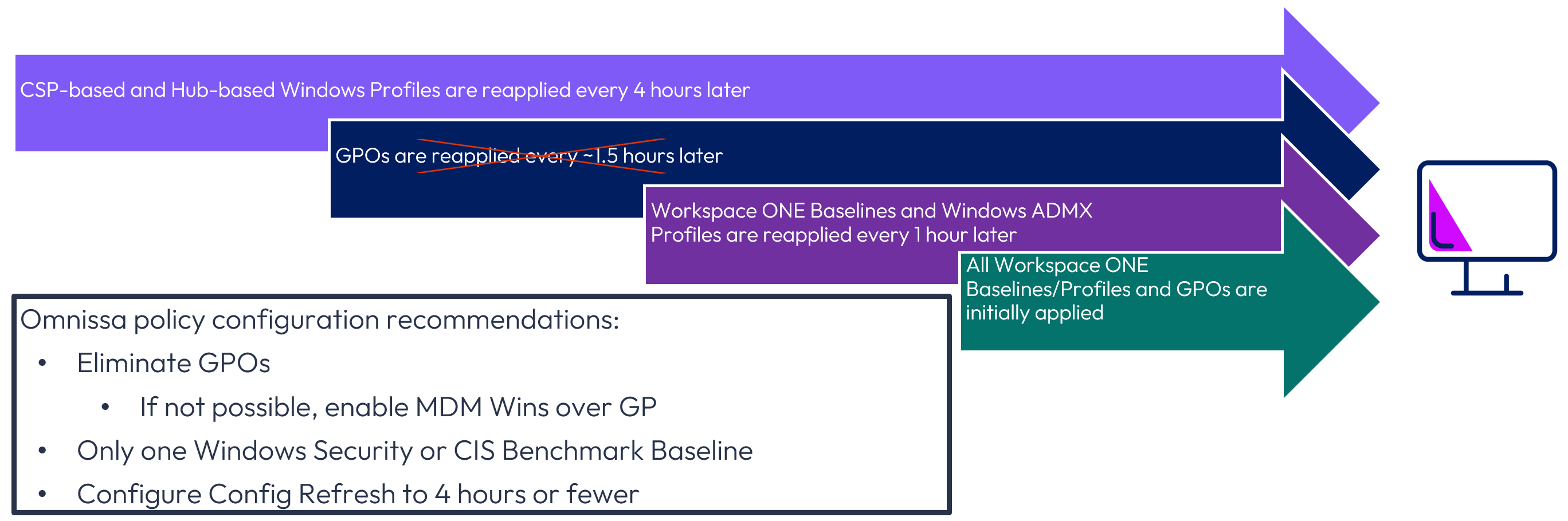 Regarding the specific reapplication time, Omnissa recommends 4 hours or fewer to maximize the security of your Windows devices. The interval decision should be made in conjunction with your Security team.