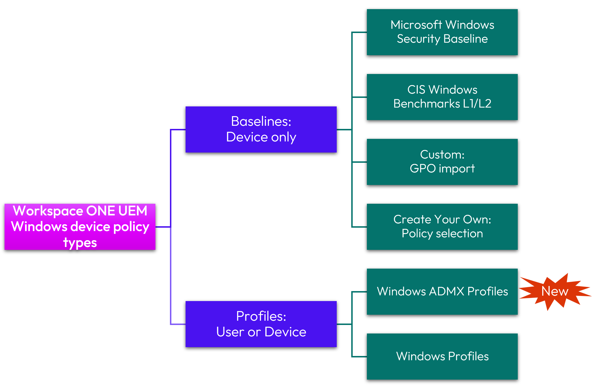 - Workspace ONE UEM Profiles, including Windows Profiles and the new Windows ADMX Profiles