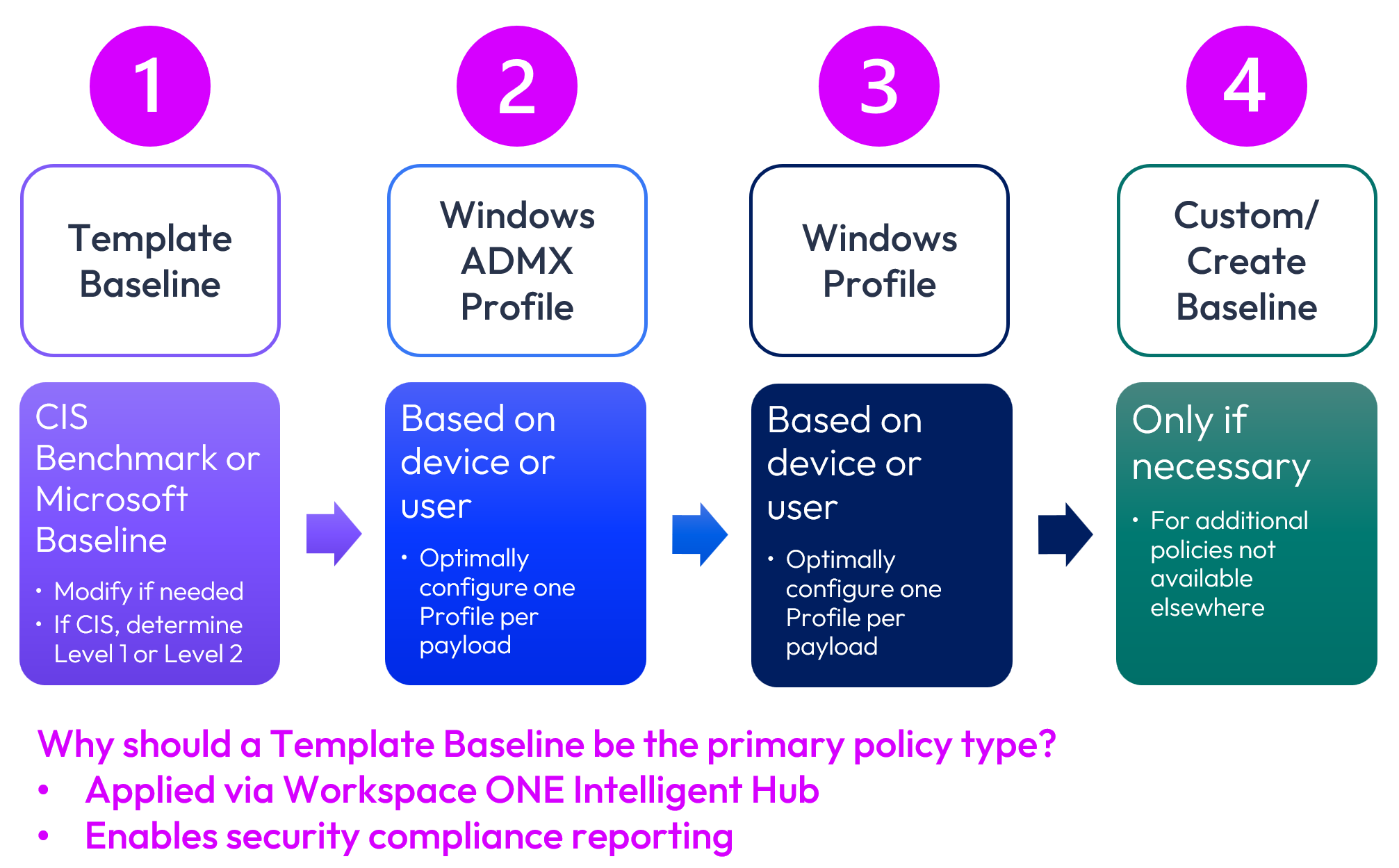 Baselines should be the primary security policy due to the built-in industry templates. Many CISOs and other Security professionals designate one of two industry templates as the corporate standard. Thus, using a Baseline as the starting point for securing and managing Windows devices streamlines, simplifying adherence to security requirements.