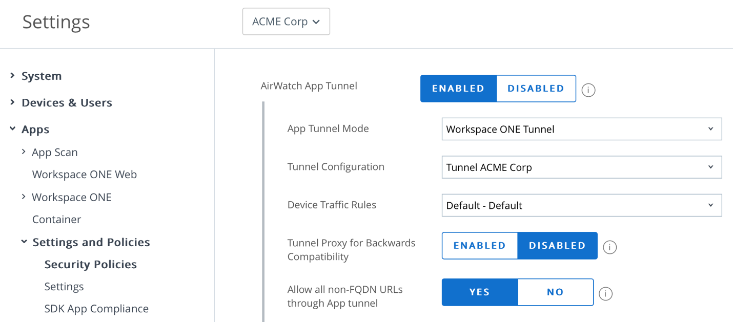 To enable Tunnel for SDK-based apps, navigate to Groups and Settings > Apps > Settings and Policies > Security Policies in the Workspace ONE UEM Console.