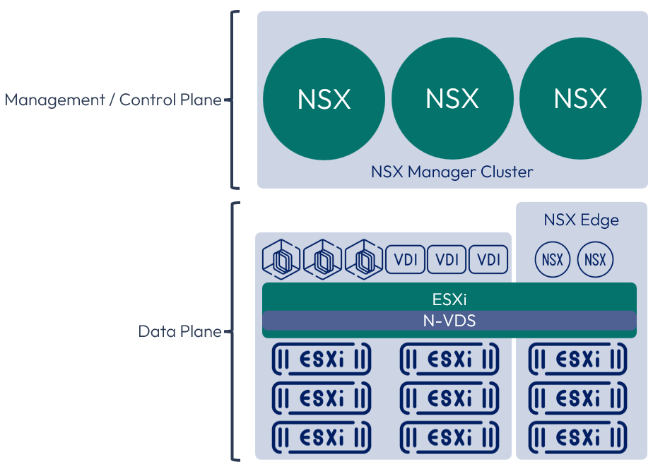 | NSX Manager cluster | The NSX Manager Cluster is deployed as a virtual appliance in a set of three appliances for redundancy and scalability. The NSX Manager Cluster represents the Management and Control Plane of the NSX deployment. The NSX Manager Cluster operates a separate user-interface for administration. |