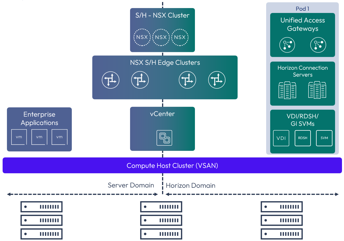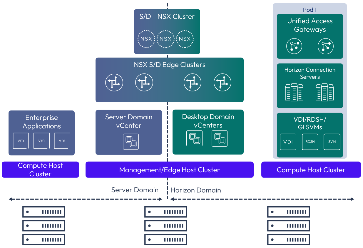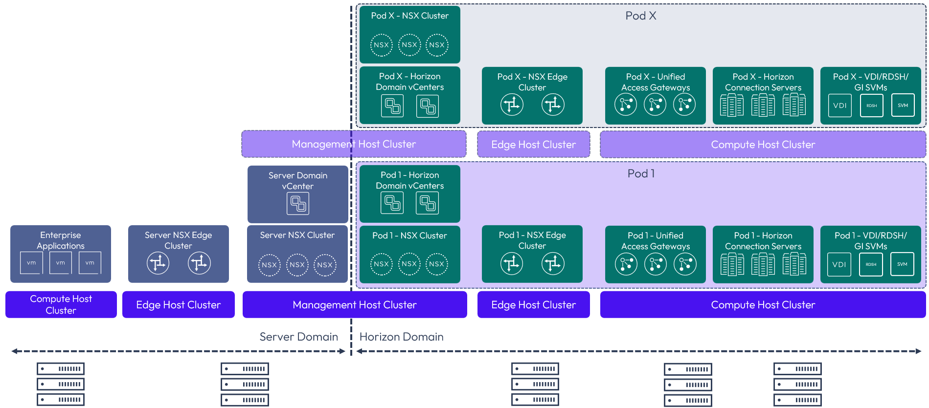 The management clusters for multiple pods could be collapsed and share the management cluster for domains to reduce the overall hardware needed and reduce some complexity of the design. As the scale of an environment increases with more pods, or to spread the fault domain, this could also be split out into separate management clusters.