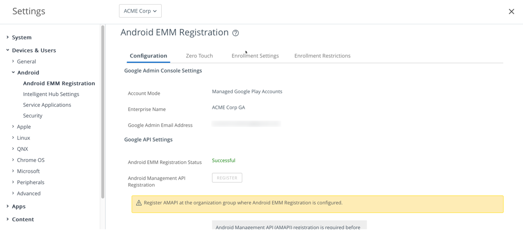 - If Android EMM registration has not already been configured for your UEM environment, see the section below. This is only done once per tenant to activate Android device management.