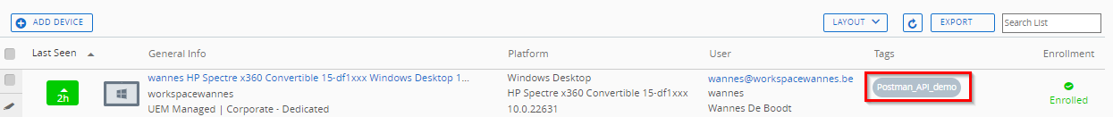 Let's see how to achieve this simple goal without touching the UEM console: find Windows devices for user Wannes and apply a tag to those devices.