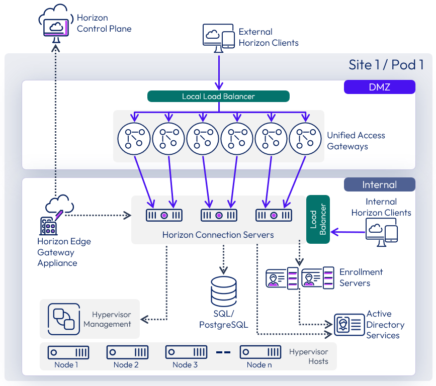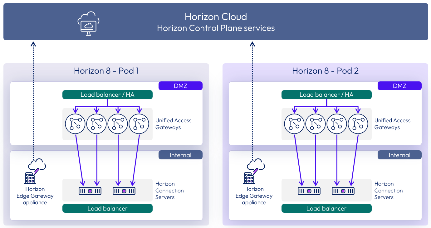 | 2023-06-02 | New section on Horizon Cloud Service to give guidance on connecting to the Horizon Cloud Service using the Horizon Edge Gateway appliance. Added detail to External access and the options for load balancing Connection Servers when deployed in combination with Unified Access Gateways. Various other rewrites and additions for clarity. Updated for Horizon 8 2303 |