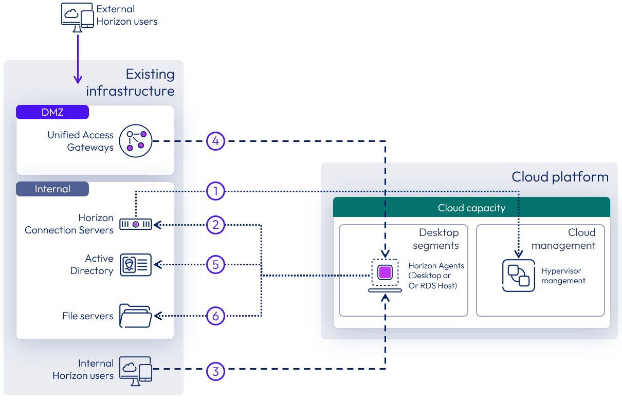 For more detail on how a Horizon connection is formed between the components, see Understand and Troubleshoot Horizon Connections.