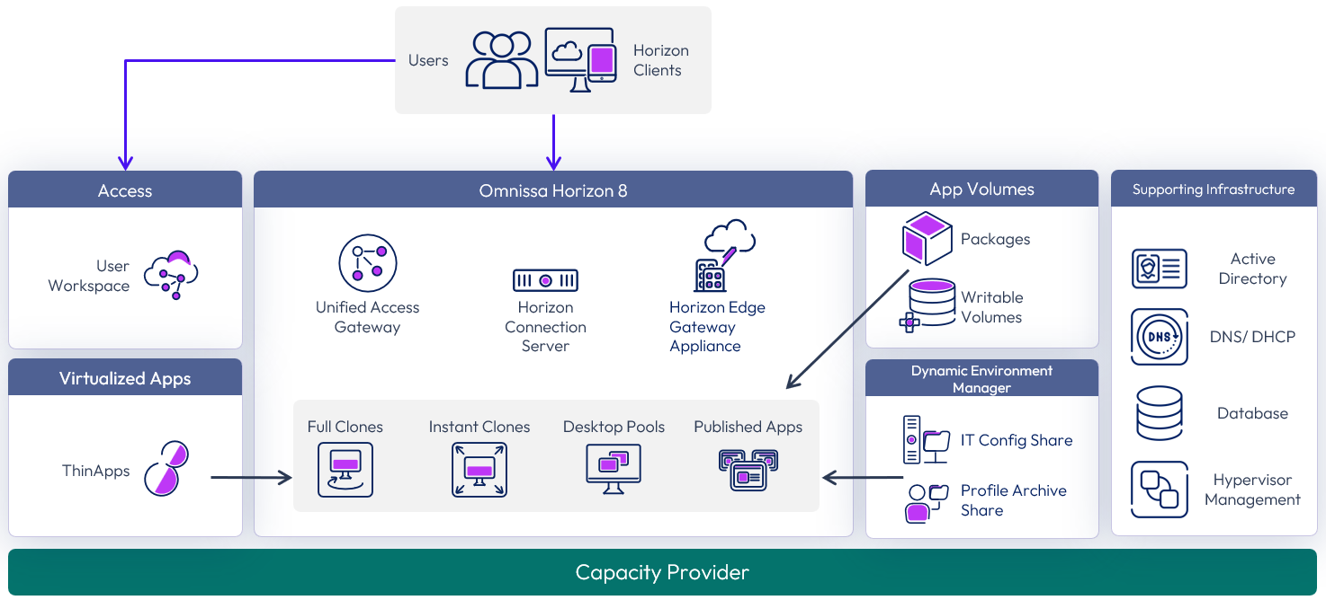 Omnissa Horizon 8 manages and delivers virtualized or hosted desktops and applications to end users. Horizon allows you to create and broker connections to Windows virtual desktops, Linux virtual desktops, Remote Desktop Server (RDS)–hosted applications and desktops, Linux-hosted applications, and Windows physical machines.