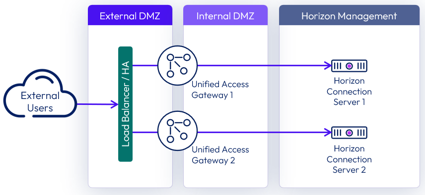 - Optionally, when you use Cloud Pod Architecture, you can deploy a global load balancer (such as F5, AWS Route 53, or others) between the pods. The global load balancer provides a single-namespace capability that allows the use of a common global namespace when referring to Horizon CPA. Using CPA with a global load balancer provides your end users with a single connection method and desktop icon in their Horizon Client or Workspace ONE console.