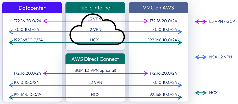 Simplify migration and increase interoperability between your data center and VMC on AWS with AWS networking service AWS Direct Connect. This service uses a dedicated, secure network connection to an organization’s on-premises data center. AWS Direct Connect can provide a more consistent network experience than VPN connectivity via the public internet.