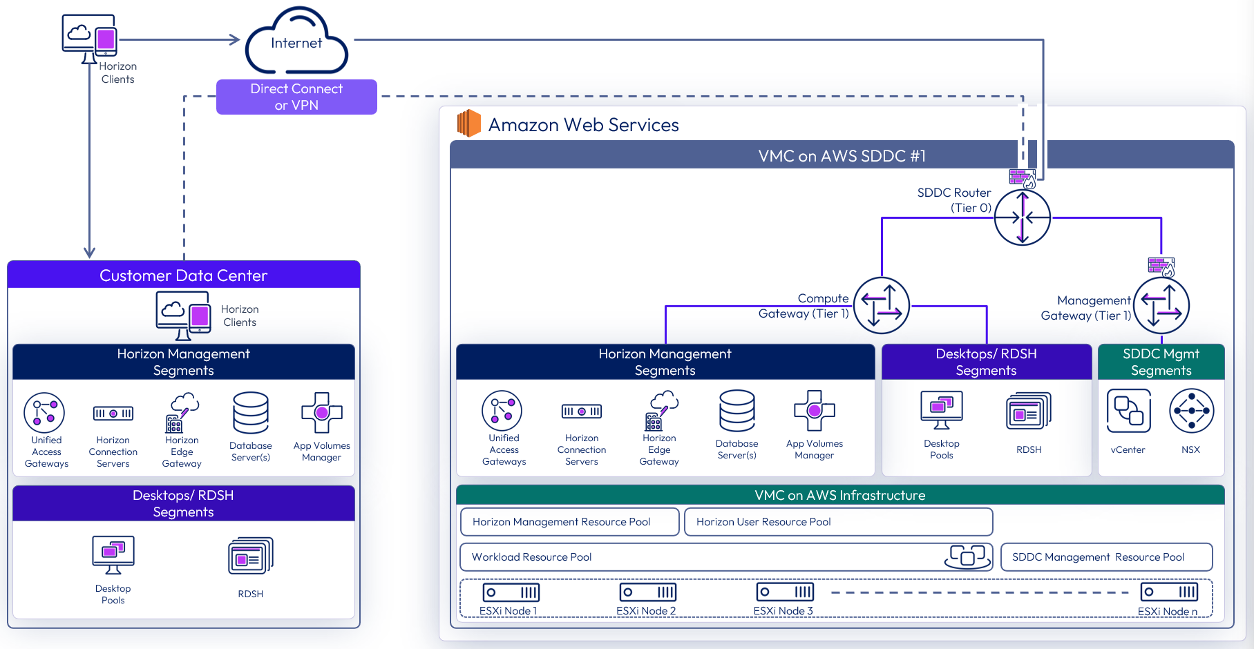 For Horizon deployments, AWS Direct Connect enables users to connect to resources that are yet to migrate to the cloud and are hosted in an on-premises datacenter, and/or to their virtual desktop from an organization’s premises with predictable, consistent performance.