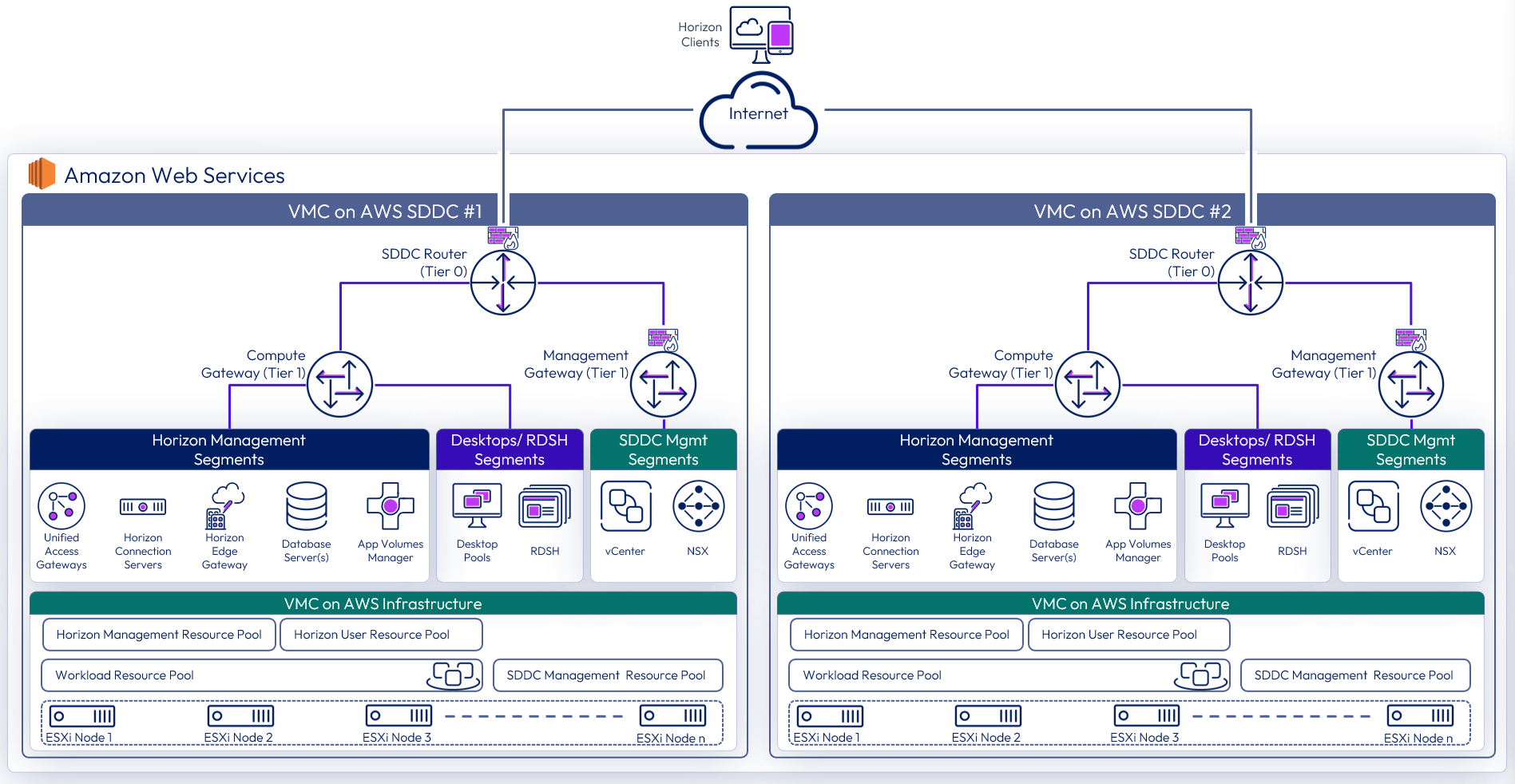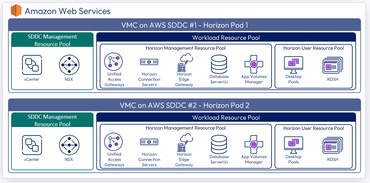 A key concept of Horizon, whether deployed on VMC on AWS or on-premises is the use of blocks and pods. See the Pod and Block section in Horizon 8 Architecture.