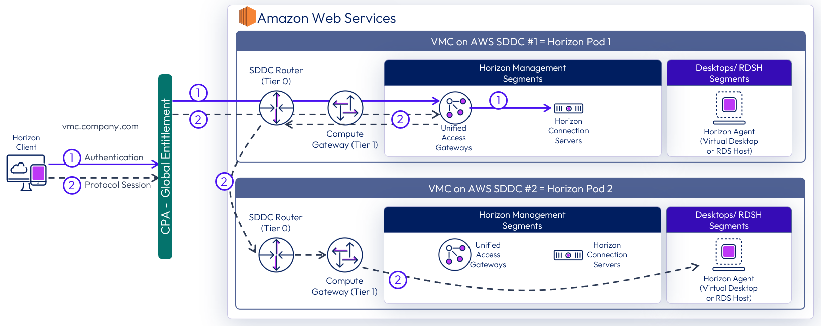 You can also stretch CPA across Horizon pods in two or more VMC on AWS data centers with the same flexibility to entitle your users to one or multiple pods as desired.
