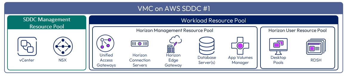 - Federated Architecture - Where the Horizon management components are located in Amazon EC2 and the Horizon resources (desktops and RDS Hosts for published applications) are located in the SDDCs.